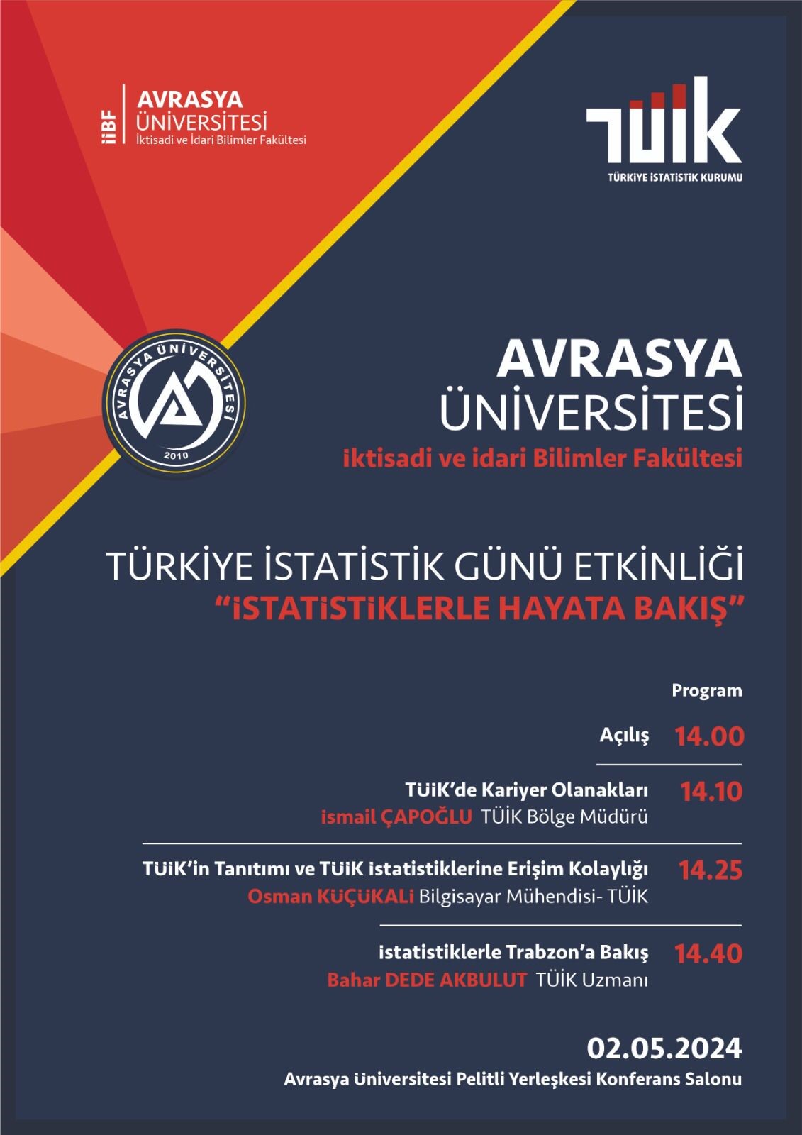 02 Mayıs 2024 tarihinde, Avrasya Üniversitesi İktisadi ve İdari Bilimler Fakültesi tarafından Türkiye İstatistik Günü kapsamında “İstatistiklerle Hayata Bakış” temalı bir etkinlik düzenlenmiştir. Pelitli Yerleşkesi Konferans Salonu’nda gerçekleştirilen programa TÜİK Trabzon Bölge Müdürü Sayın İsmail ÇAPOĞLU, TÜİK’te görevli uzmanlar ve akademisyenler katılım sağlamıştır.